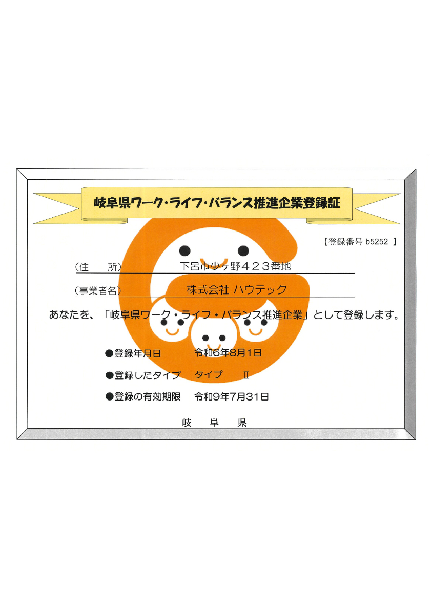 岐阜県ワーク・ライフ・バランス推進企業登録証