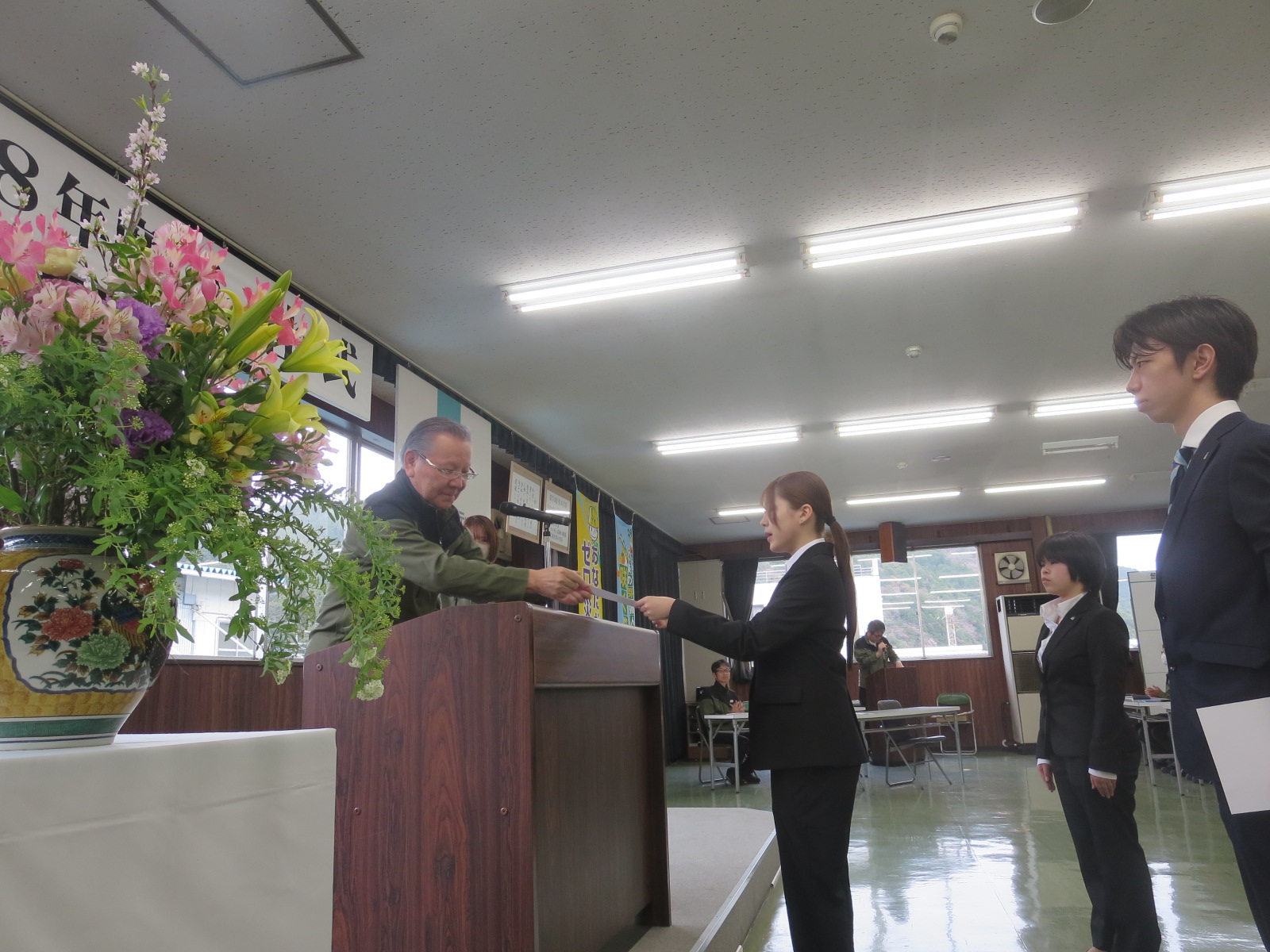 辞令交付・記念品授与を行い、皆さん少し緊張した面持ちでしたが、新入社員紹介の際には3名より元気な挨拶も聞くことができました。